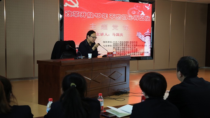 為紀(jì)念改革開放40周年,進(jìn)一步激勵(lì)黨員不忘初心、牢記使命。 11月28日,公司黨委牽頭舉辦了 “改革開放四十年 不忘初心再出發(fā)”的主題黨課。120余名黨員在我司大會(huì)議室聆聽了講座。本次主題黨課在蘭州市西固區(qū)委組織部和西固區(qū)兩新黨建辦公室指導(dǎo)下開展,本樓宇內(nèi)5家單位以及兩新辦和社區(qū)共同參與。組織這種形式的大黨課,就是貫徹落實(shí)全區(qū)組織工作會(huì)議精神,加強(qiáng)“五化五強(qiáng)”黨支部建設(shè),推進(jìn)街道社區(qū)黨建、單位黨建、樓宇黨建互聯(lián)互動(dòng),努力提升城市基層黨建工作水平。